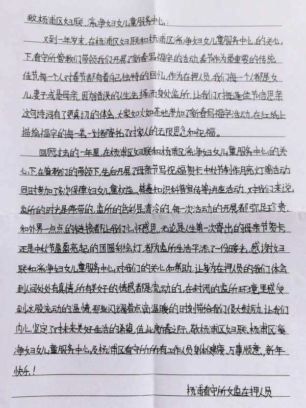 近日,杨浦区妇联收到了来自杨浦区看守所女监在押人员手写的感谢信。信中质朴的文字藏不住在押女性的深深感激之情和对未来生活的期待。