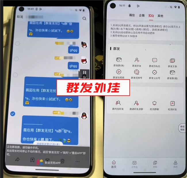 目前,外挂工具种类繁多,且随着技术发展快递更新迭代。外挂黑产团伙一般会以“QQ 多开、QQ代挂、QQ 个性化定制、Android模拟器、刷机”等各种噱头诱导用户直接下载外挂工具使用。此外,他们还会利用群控技术开发所谓的“营销神器”外挂工具,比如通过批量操作的方式实现自动化注册账号、加好友、发消息等功能,或者通过QQ机器人实现定时群发消息、自动回复、自动聊天等控制功能,对正常用户造成骚扰,对网络正常有序发展造成恶劣影响。