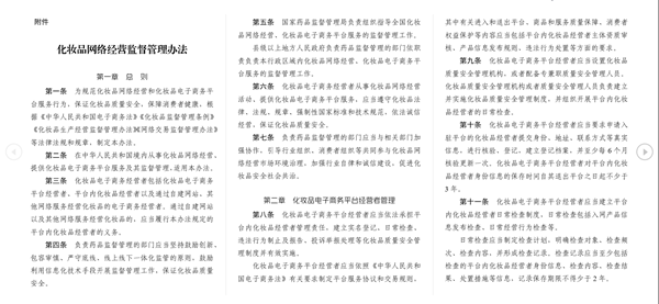 据国家药监局,为进一步强化化妆品网络经营监管工作,规范化妆品网络经营行为,保证化妆品质量安全,根据《化妆品监督管理条例》《化妆品生产经营监督管理办法》等,国家药监局组织制定了《化妆品网络经营监督管理办法》,现予公布,自2023年9月1日起施行。