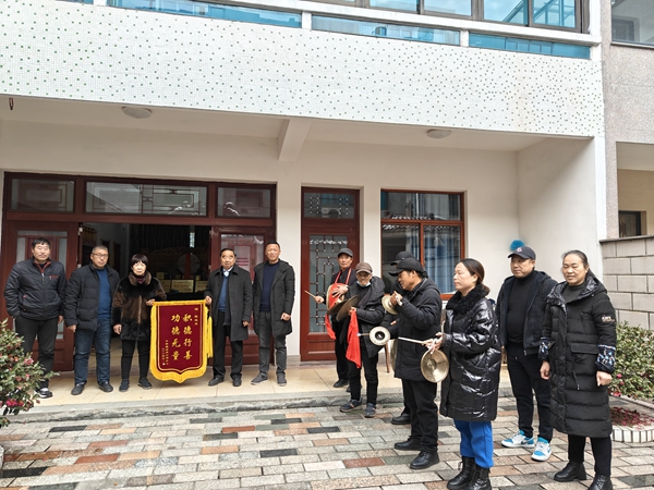 “谢谢,谢谢,哪用这么客气,这是我应该做的。”25日上午,千祥镇后周村两委会敲锣打鼓将一面“积德行善 功德无量”的锦期送到陈连弟手中,对其捐资装路灯善举表示感谢!