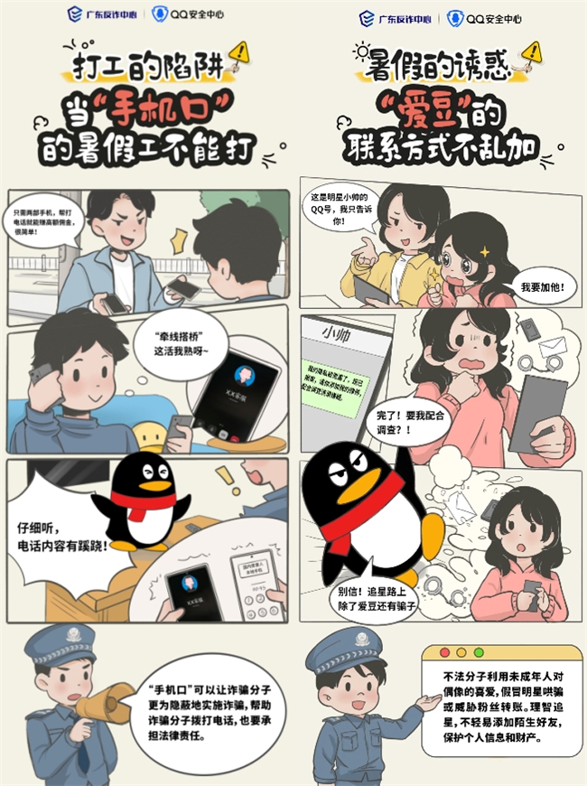 暑假期间,许多用户特别是学生群体上网时间增加,不法分子开始抓住机会实施诈骗。为针对性地加强防范、打击“诈骗暑期档”问题,广东反诈中心联手QQ安全中心推出“安全不放假”暑假网络安全科普内容,聚焦高薪兼职陷阱、虚假游戏福利、缴费退费骗局等暑期高发、高危诈骗问题,通过手绘剧情海报、动画视频等多种形式拆解最新诈骗手法,普及最新的网络安全知识,助力广大用户增强自我保护意识。