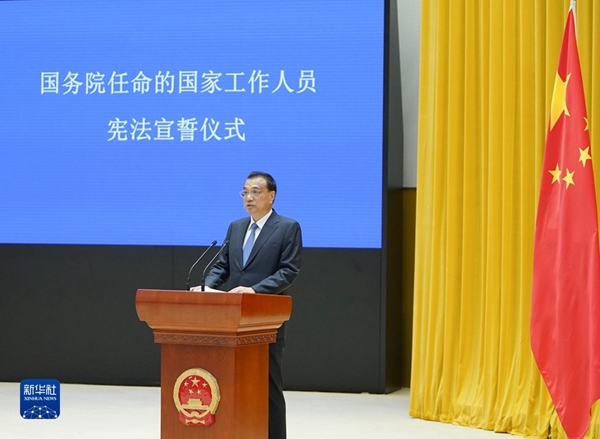 宣誓后,李克强希望大家铭记这一庄严时刻,坚守誓言、以行践诺。他要求,要以习近平新时代中国特色社会主义思想为指导,依宪施政、依法行政,恪尽职守、勤政为民。要依法履职尽责。法乃国之纲纪、行之准绳。要把尊法学法守法用法化为自觉行为和必备素质,运用法治思维和方式作决策、出政策、抓落实,更好发挥法治固根本、稳预期、利长远的作用。要勇于担当作为。志不求易,事不避难,尊重客观规律,立足岗位创造性工作,做出经得起检验的实绩。坚持发展是解决我国一切问题的基础和关键。要全面贯彻新发展理念,高效统筹疫情防控和经济社会发展,务实重干,积极应对困难挑战。把稳增长放在更加突出的位置,统筹稳增长、调结构、推改革,促进经济社会持续健康发展。要倾情竭力为民。细察民情,念兹在兹,以民之所利而利之,及时解决群众急难愁盼问题,在发展中不断增进民生福祉。当前尤其要把群众安危冷暖记在心头,扎实做好民生保障工作。要清廉奉公。既然从事公职就要秉公去私。要以上率下,正己率人,始终绷紧依法依规谨慎用权这根弦,堂堂正正做人,干干净净做事。大家重任在肩,惟有勤勉不怠。要砥砺进取,为建设富强民主文明和谐美丽的社会主义现代化强国不懈奋斗。
