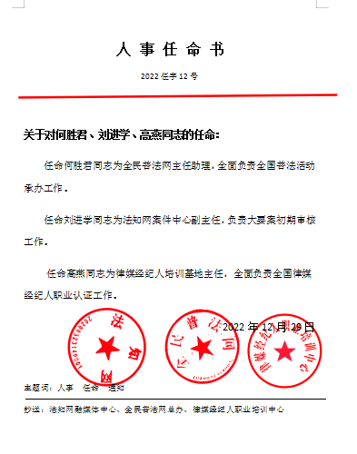 任命何胜君同志为全民普法网主任助理,全面负责全国普法活动承办工作