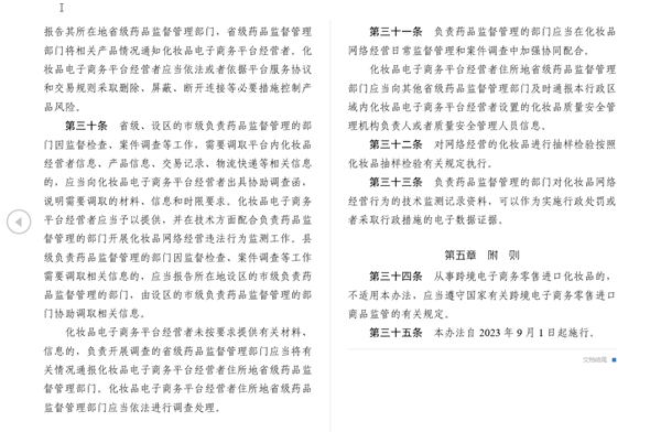 据国家药监局,为进一步强化化妆品网络经营监管工作,规范化妆品网络经营行为,保证化妆品质量安全,根据《化妆品监督管理条例》《化妆品生产经营监督管理办法》等,国家药监局组织制定了《化妆品网络经营监督管理办法》,现予公布,自2023年9月1日起施行。